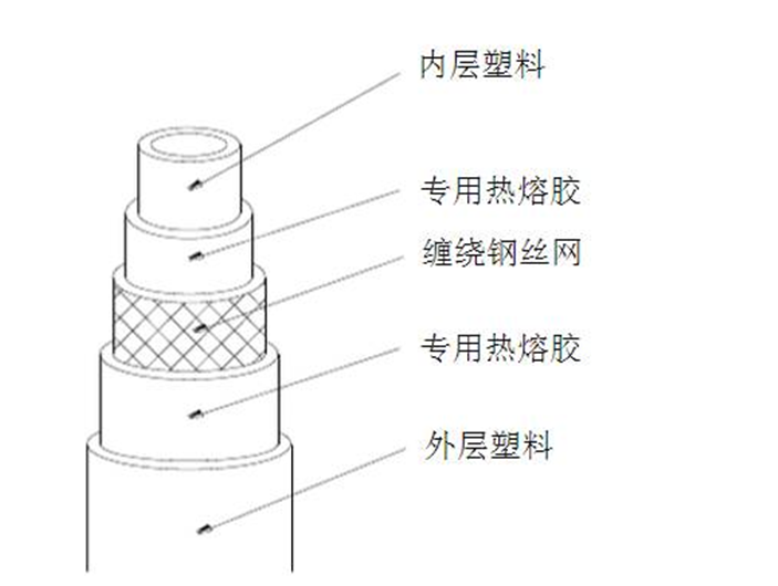 管材結構特點 鋼絲網骨架塑料(聚乙烯)復合管的結構特點是在內層管壁和外層管壁中間設置有兩層或多層纏繞形成的鋼絲網格狀增強層。如圖1。