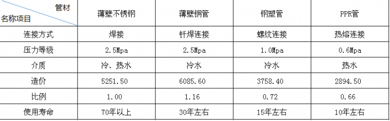 從上表中可以看出,在住宅中各種給水管材在單位面積內的造價并不高,平均在30多元左右,事實上建筑管材與房價或工程造價相比,只占其中的0.2%-0.5%,那么因薄壁不銹鋼管而多出的費用顯得微乎其微。若僅從造價的因素分析,以上四種管材總體造價較低的是PP-R、其次是鋼塑管和不銹鋼管,其中薄壁銅管造價最高。