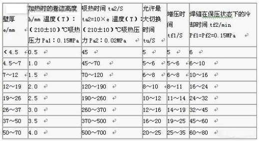 ⑥加熱板溫度達到設定值后,放入機架,施加規定的壓力,直到兩邊最小卷邊達到規定高度時,壓力減小到規定值(管端兩面與加熱板之間剛好保持接觸,進行吸熱),時間達到后,松開活動架,迅速取出加熱板,然后合攏兩管端,其切換時間盡量縮短,冷卻到規定時間后,卸壓,松開卡瓦,取出連接完成的管材。