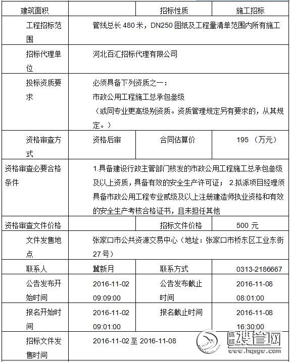 建設地點:張家口市建國醫院北圍墻外; 規模:管線總長480米,DN250;合同估算價:195萬元;計劃工期:2016年12月20日-2017年4月17日共120日歷日;招標范圍:管線總長480米,DN250圖紙及工程量清單范圍內所有施工;質量要求:合格。