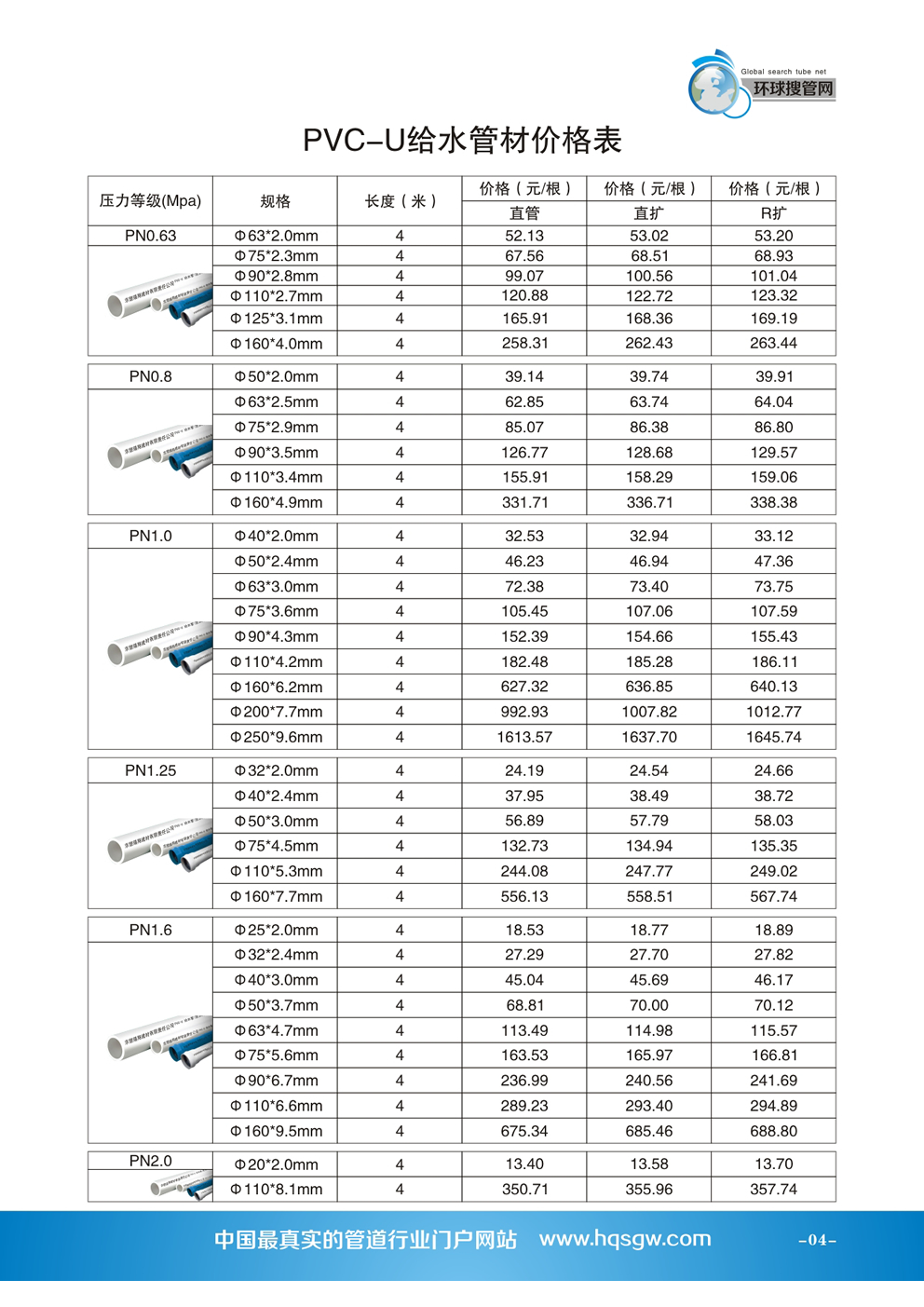 1、管道的壓力規定。(1)PVC-U給水管道所示的壓力均表示為公稱壓力,用Mpa表示,1Mpa≈10kgf/cm2即管材在20℃條件下,輸送介質的工作壓力。但隨著介質的溫度的升高(不得輸送>50℃的介質)工作壓力隨之減小,這從客觀上在選擇給水管道須考慮足夠的壓力的安全系數。(2)給水管材的公稱壓力規定為:0.6Mpa、0.8Mpa、1.0Mpa、1.25Mpa、1.6Mpa等5種。(3)同等規格管材的公稱壓力的大小一般以管材的壁厚來劃分。(4)每個壓力區的最小口徑的管材規定為:0.6Mpa管材的最小口徑為63mm,0.8Mpa管材的最小口徑為50mm,1.0Mpa管材的最小口徑為40mm,1.25Mpa管材的最小口徑為32mm,1.6Mpa管材的最小口徑為20mm和25mm。(5)給水管材的公稱壓力一般為1.6Mpa,且與各種壓力的管材相配套。