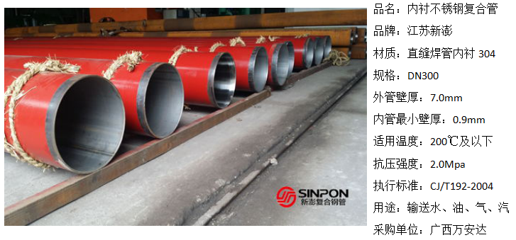 江蘇新澎復合材料有限公司,多年研發經驗,15項專利技術,多年來堅持務實發展,潛心鉆研,打造安全優質的內襯不銹鋼輸水管。