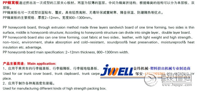 PP蜂窩板的主要規格:厚度2-12m m ,寬度800-1300m m 。
