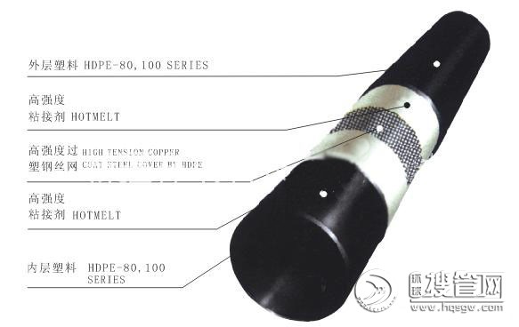 鋼絲網骨架塑料(聚乙烯)復合管又稱“鋼絲網管、鋼絲網骨架塑料復合管、SRTP管STSCP管、SPE管”,它是以正、逆方向螺旋纏繞在管材中分布的高強度鋼絲為增強分架、其內外層以高密度聚乙烯為基體,并通過熱熔膠復合經連續擠出成型的新型環保管材。它既保留了鋼管優良的承壓性能,又保留了塑料管良好的衛生性能以及易于敷設、連接可靠、使用壽命長等特點。不僅適用于市政和建筑的給排水、消防和氣體輸送,而且可以大量運用于化工、石油、醫藥等。