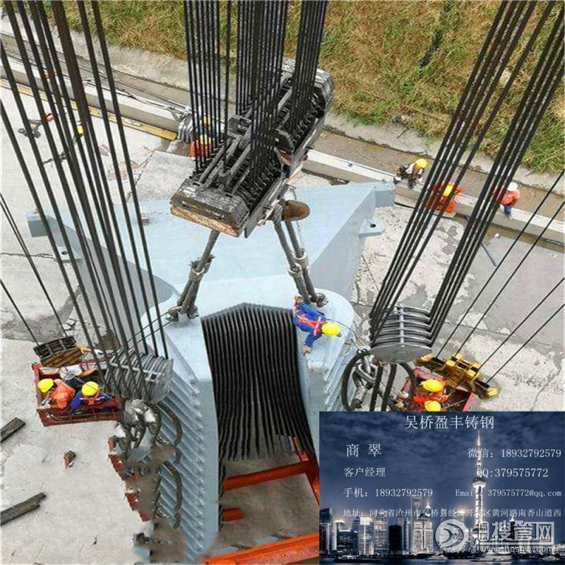 索鞍是專供懸索繞過塔頂?shù)闹尾⑹怪骼|平順地改變方向的結(jié)構(gòu)。索鞍的上座由肋形的鑄鋼塊件組成,上設(shè)有索槽安放懸索。在剛性橋塔中的索鞍,一般還在上座下設(shè)一排輥軸,輥軸下設(shè)下座底板,把輥軸傳來的集中載荷更好地分布在塔柱上。在擺柱式或柔性橋塔中的索鞍,僅設(shè)鑄鋼的上座,并通過螺栓與塔柱固定。索鞍鑄件較重,例如金門大橋索鞍重150噸,長6.58 m,寬3.05 m,高3.22 m。為了便于制造,分三段澆鑄。為了在安裝時(shí)便于調(diào)整,在上座下往往設(shè)一排輥軸,當(dāng)調(diào)整完畢后將其封死,仍然使它固結(jié)在塔頂。有的吊橋?yàn)榱藴p輕索鞍重量不采用鑄件,而采用焊接的鋼結(jié)構(gòu)索鞍,圓弧半徑一般為主索直徑的8~12倍,以此減少主索鋼絲的二次應(yīng)力。