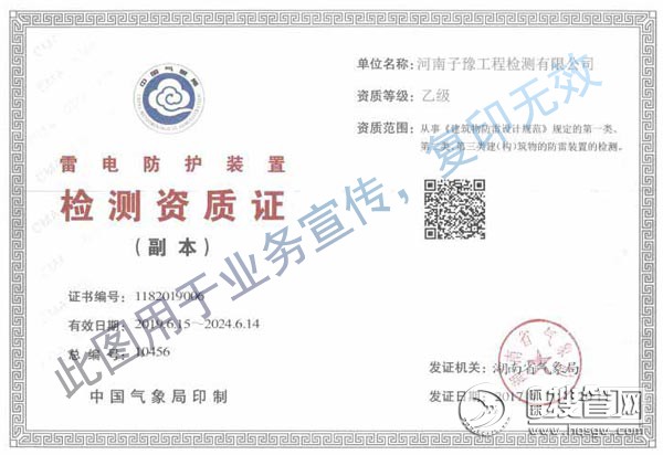 河南子豫工程檢測有限公司成立于2018年,經鄭州市金水區工商管理和質量技術監督局批準,注冊資金100萬元,取得了氣象局頒發的乙級防雷檢測資質。主要經營范圍包括防雷裝置檢測及技術服務、技術咨詢。河南防雷裝置安全檢測有限公司